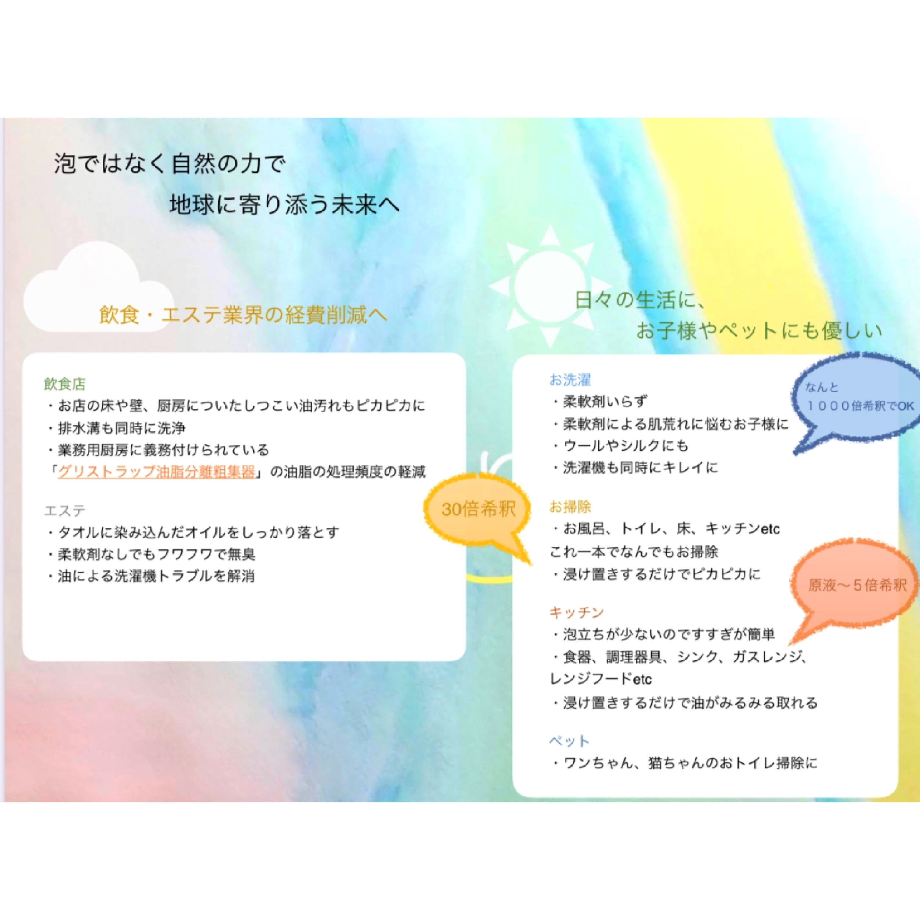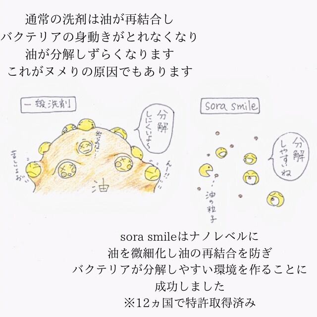 油をナノレベルにまで生分解し再結合させず、あらゆる場所の油汚れをみるみるキレイにし、排水路まですっきりさせ、海や地球環境を守ります。
