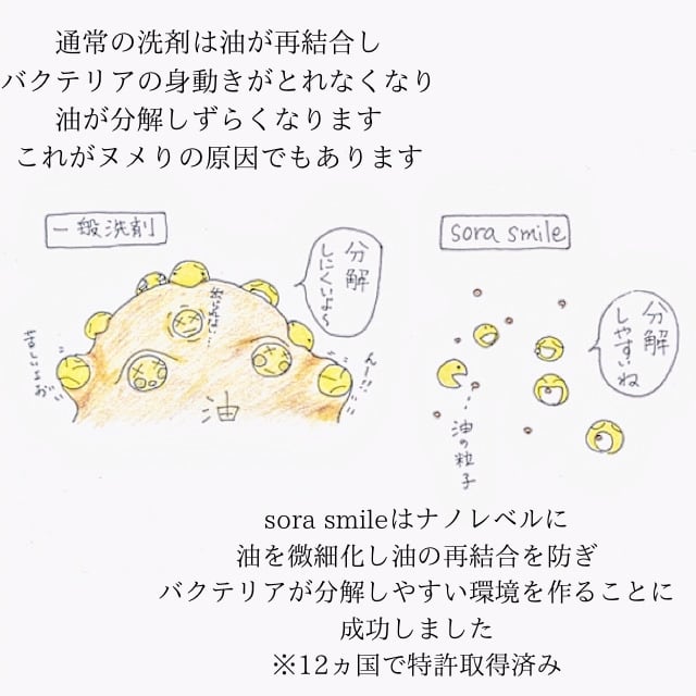 油をナノレベルにまで生分解し再結合させず、あらゆる場所の油汚れをみるみるキレイにし、排水路まですっきりさせ、海や地球環境を守ります。